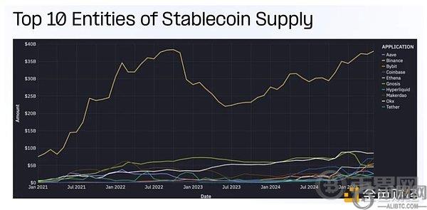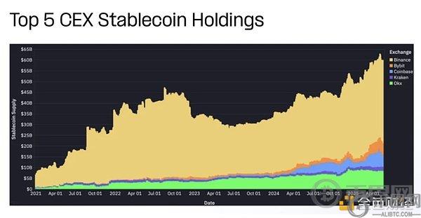 大多数稳定币供应都集中在**化交易所,其中占据相当大的**地位。DeFi 协议和发行者也占有相当大的份额。