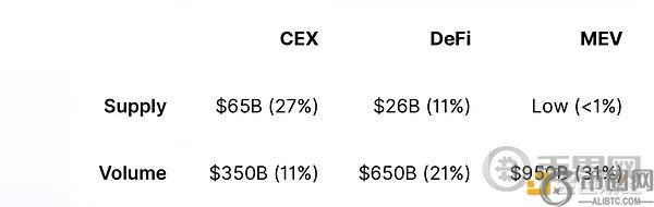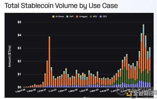 稳定币交易量**的实体往往是**化交易所,其次是DeFi 和发行机构。CEX 交易量并不反映 CEX 平台上的交易,因为大多数交易发生在链下。相反,它反映了用户充提、交易所间转账以及内部运营活动。