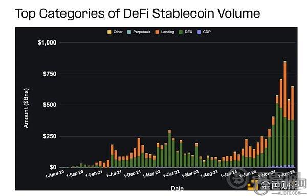 过去六个月,DeFi 稳定币的月交易量已从约 1000 亿美元增长至 6000 亿美元以上,这主要得益于去**化交易所 (DEX)、借贷市场和抵押债仓 (CDP) 的大幅增长。
