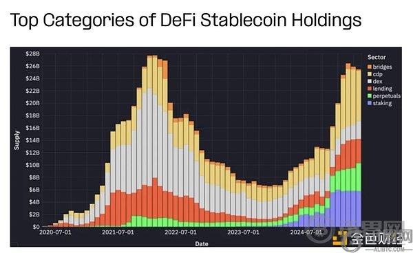 DeFi 稳定币的供应来自抵押品、流动性提供者(LP) 资产,以及借贷市场、去**化交易所 (DEX) 和衍生品协议的结算层。过去六个月,CDP、借贷、永续合约和质押的供应量几乎翻了一番。