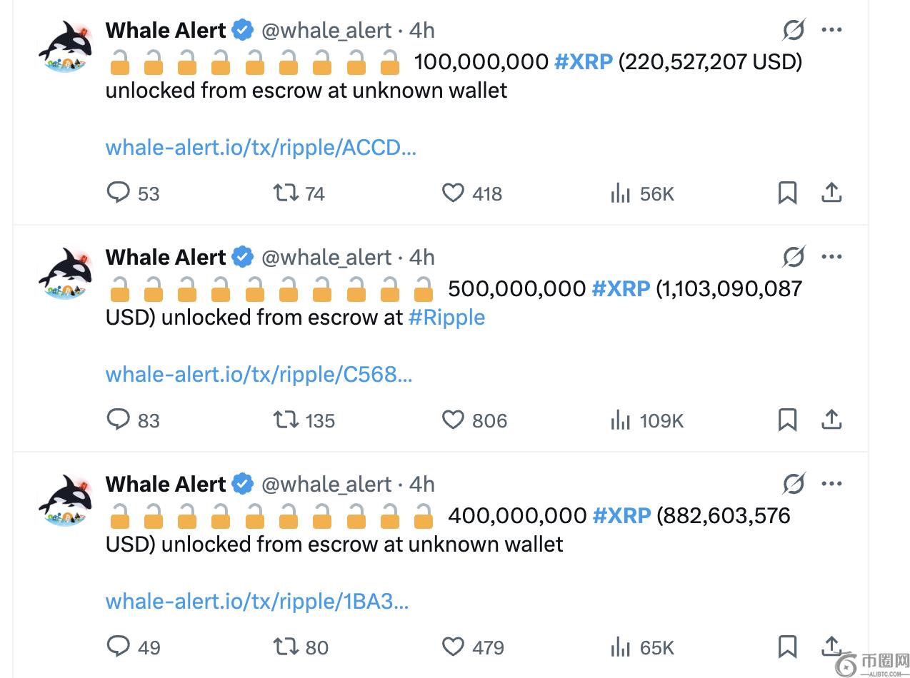 加密货币追踪服务 Whale Alert 标记了 Ripple **的托管活动。根据 X 上的一系列帖子,Ripple 通过三笔独立交易释放了 10 亿 XRP。