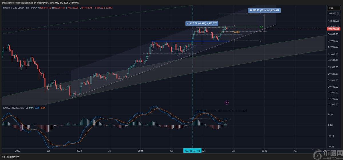 该分析师还分享了一张周线图,显示比特币的移动平均收敛散度 (MACD) 指标对 BTC 看涨。