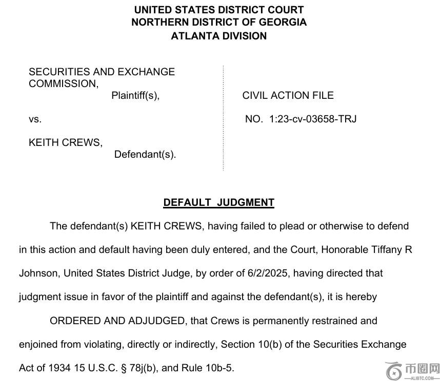 由于肯尼索居民基思·克鲁斯 (Keith Crews) 未能对与据称基于不存在的干细胞技术的加密货币发行相关的民事欺诈指控作出回应,佐治亚州一名联邦法官做出了有利于美国证券交易委员会 (SEC) 的 110 万美元缺席判决。