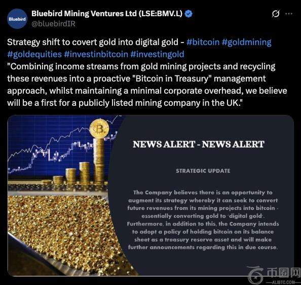 英国上市的黄金矿业公司 Bluebird 宣布计划利用其从黄金中赚取的资金来建立比特币储备。