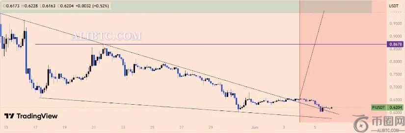 如果势头增强,Pi 价格可能随后上涨至 0.8665 美元(上次出现于 5 月 22 日)。如果 Pi 突破这一关口,下一个心理阻力位在 1 美元。这样的涨幅意味着较当前水平上涨 60%。然而,如果 Pi Network Coin 价格跌破其支撑趋势线,打破三底形态的完整性,这种看涨前景将失效。