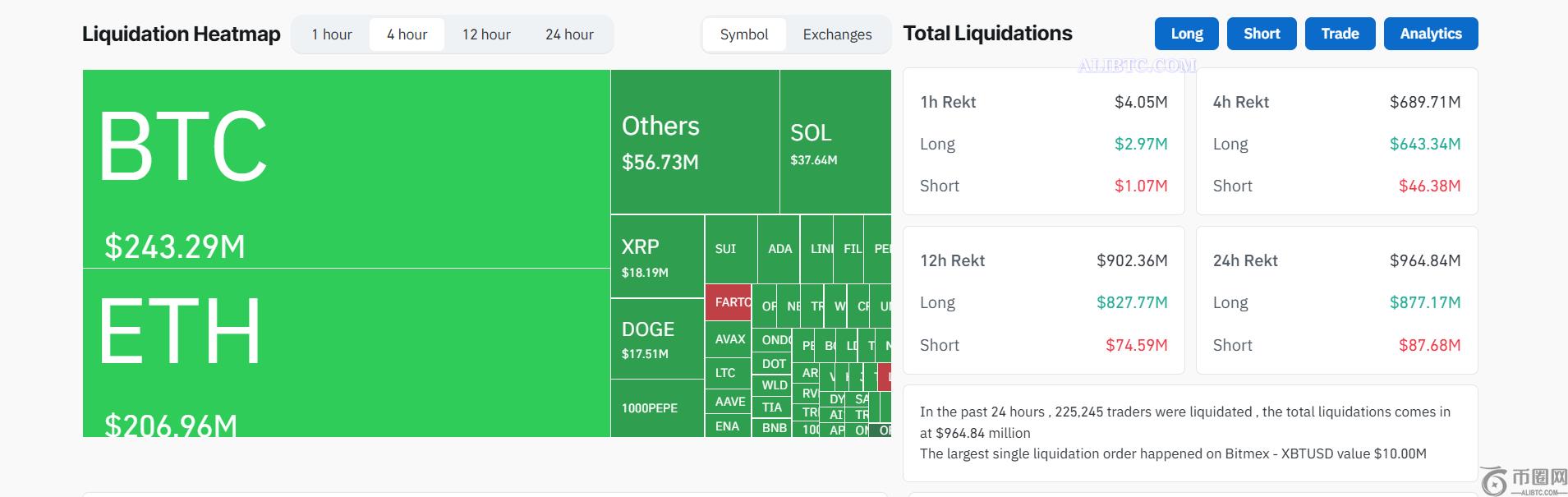 市场对政治波动作出反应,近 10 亿美元被清算,根据清算数据显示,过去 24 小时内共计清算 9.6484 亿美元的头寸,其中 8.7717 亿美元为多头头寸。