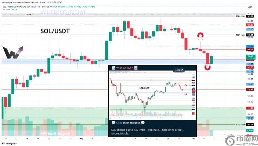 Solana 价格从 142 美元的低点小幅反弹,目前在 152 美元左右徘徊,市场即将进入周末。Bullrun_Gravano将此举标记为潜在的短期反弹尝试,价格将再次瞄准 160 美元的水平。这为经历了艰难时期的多头带来了一线希望。