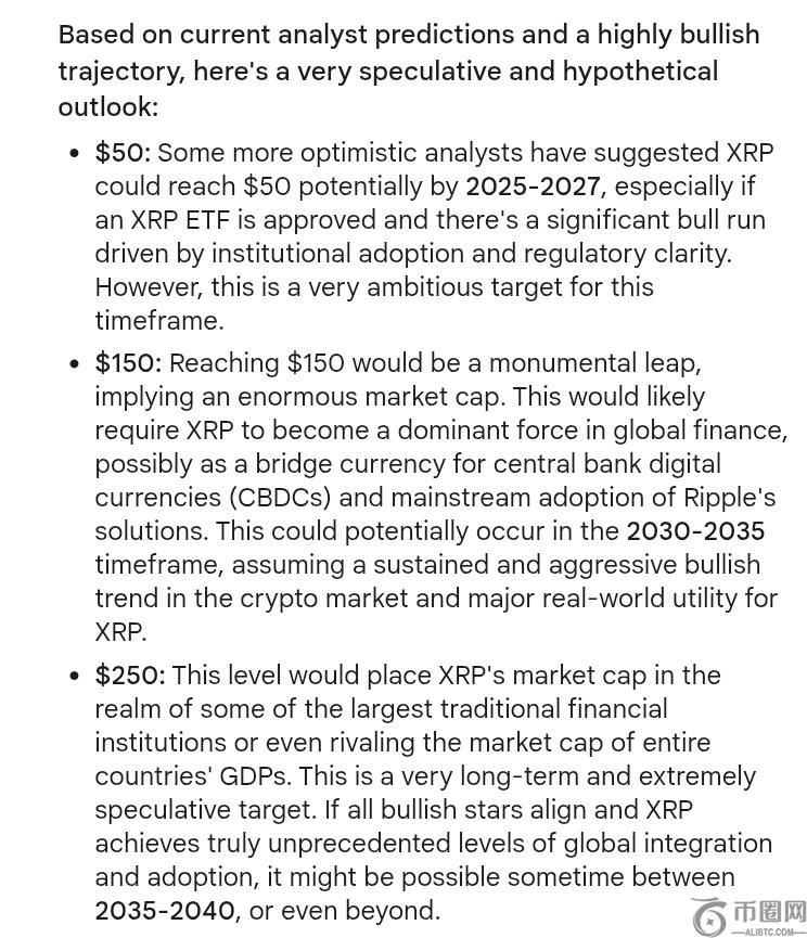 Gemini 预测,如果 XRP 成为全球金融体系中广泛使用的工具,那么 150 美元的价位可能出现在 2030 年至 2035 年之间。然而,250 美元的价位可能要到 2035 年至 2040 年甚至更久之后才能实现,而且前提是 XRP 能够实现广泛应用。全球的采用和整合。