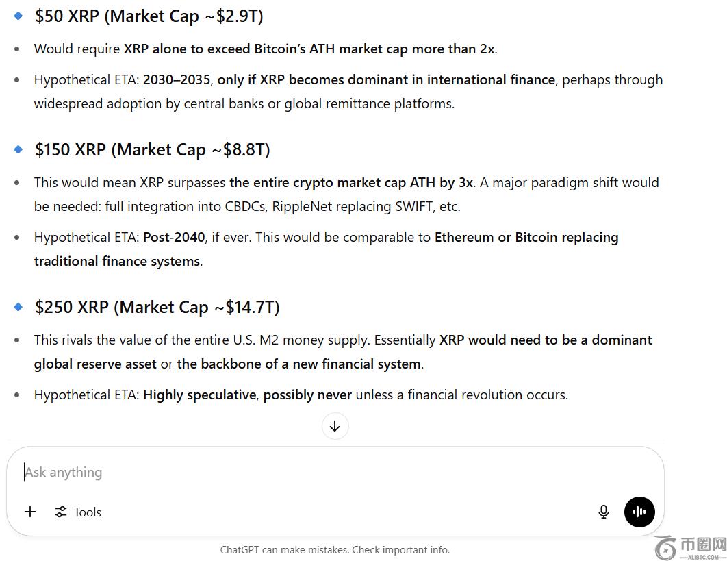 ChatGPT 预测 XRP 何时能达到 50 美元、150 美元和 250 美元