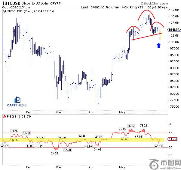 此外,头部形态在比特币于5月22日创下111,200美元的历史高点时形成,而6月3日106,843美元的右肩形态则完成了看跌形态。随着这一结构的形成,分析师预计,一旦比特币跌破颈线,将开始下跌趋势。