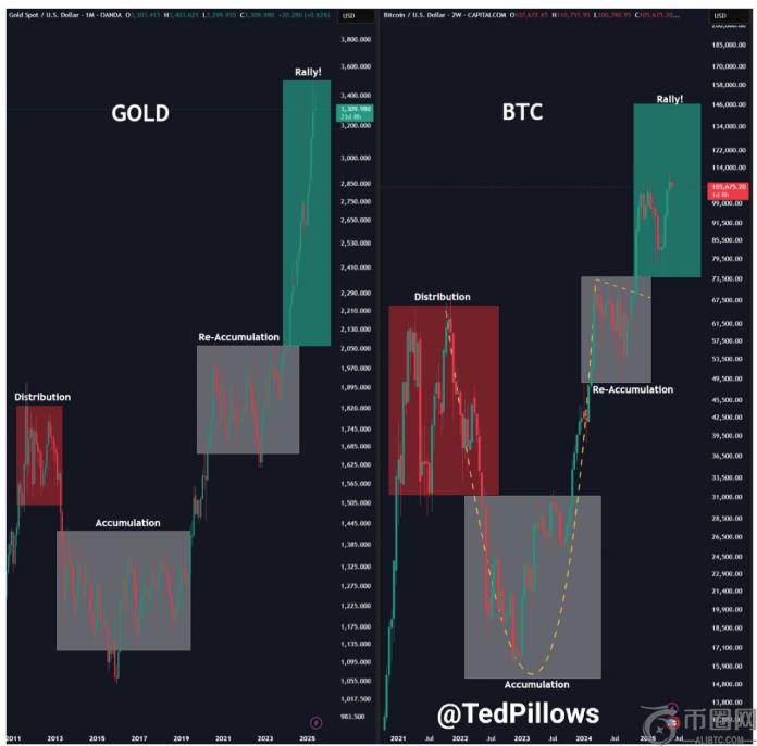 比特币出现正在走一条老路,黄金不久前也曾走过这条路。根据加密货币分析师泰德·皮洛斯在社交媒体平台X上分享的分析,目前这种**加密货币的价格结构与黄金从吸筹阶段到派发阶段再到突破性反弹的走势非常相似。
