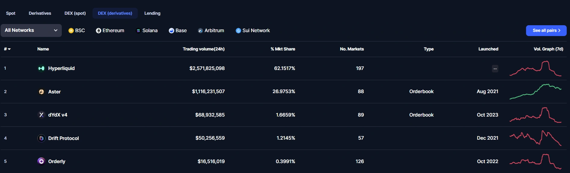目前,Hyperliquid 仍然是**去**化交易所 (DEX) 市场的领头羊,自上线以来一直保持着持续上涨的势头。它占据了 62% 的市场份额,而 Aster 紧随其后,市场份额约为 27%。Hyperliquid 在过去 24 小时内处理了约 25.7 亿美元的交易,是 Aster 11.2 亿美元的两倍多。