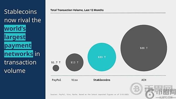 a16z Crypto在**报告中指出,过去12个月,稳定币交易量已达33万亿美元,持续创下历史新高,接近PayPal交易量的20倍,接近Visa交易量的3倍。