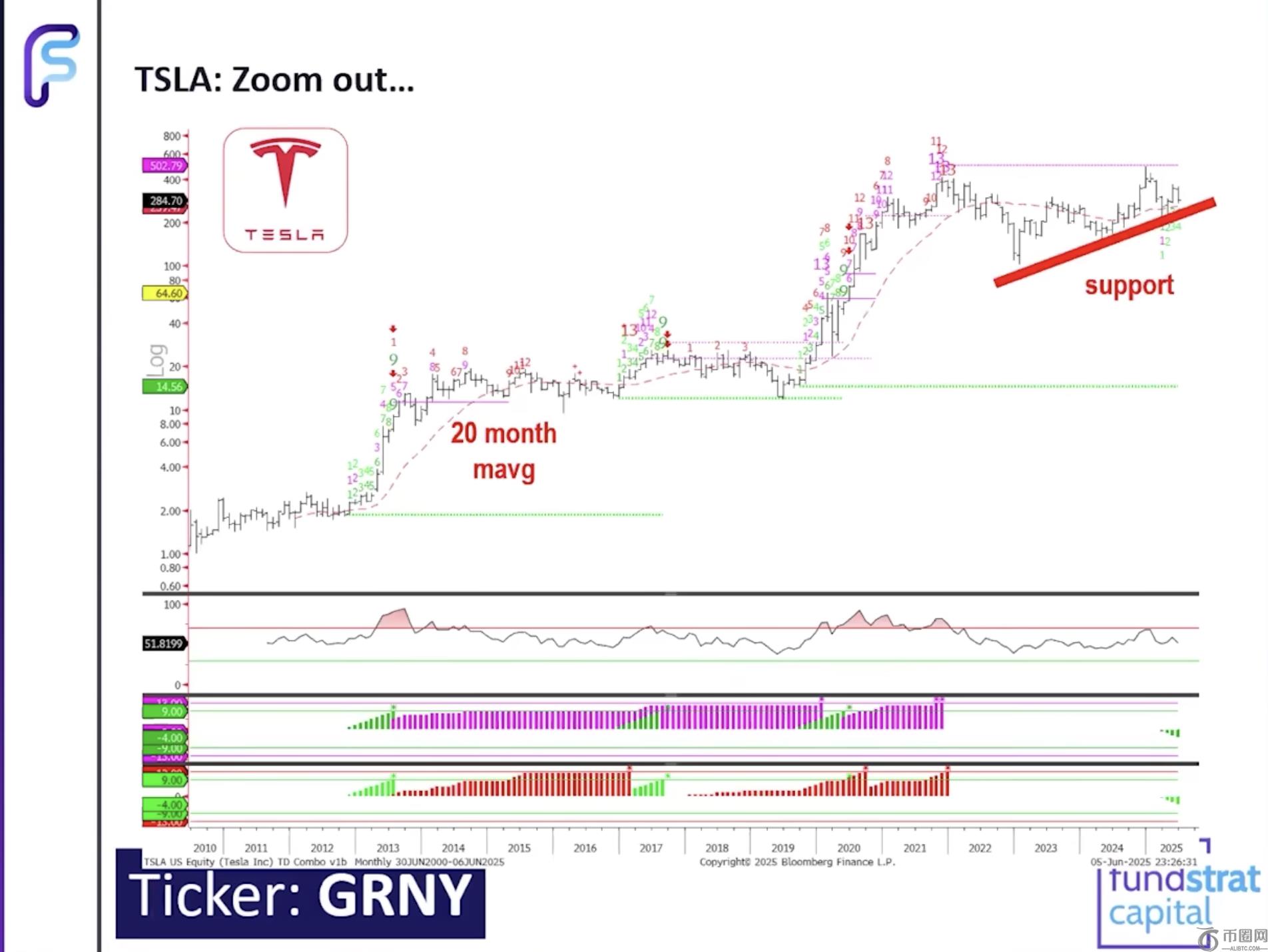 在新的视频更新中,李分享了 TSLA 的长期图表,该图表显示,即使该股从历史高点下跌了 40%,其价格也只是在触及前几年的支撑位。