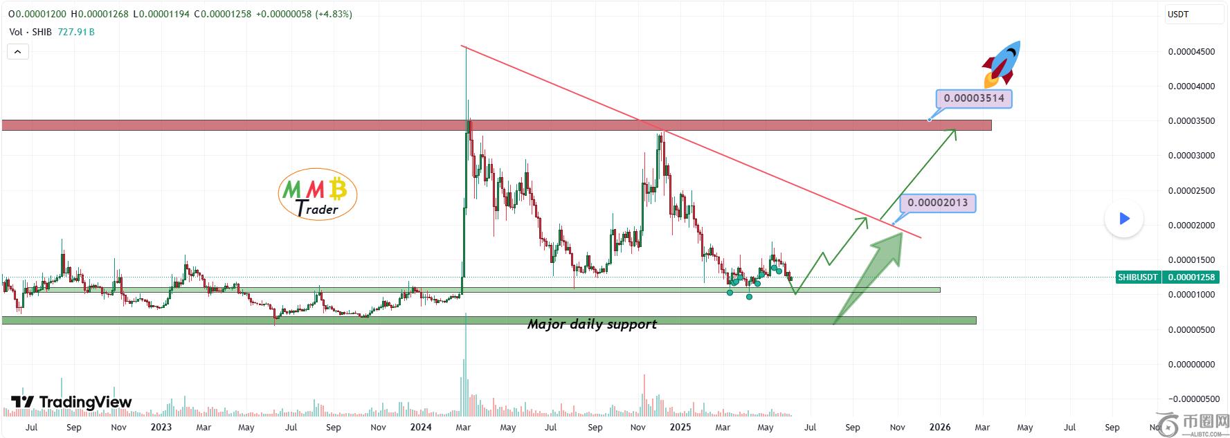 交易视图分析MMBTtrader 的数据显示,由于趋势线下行,柴犬的价格仍面临显著的看跌压力。值得注意的是,自 2024 年初以来,该趋势线一直充当着持续的阻力位。
