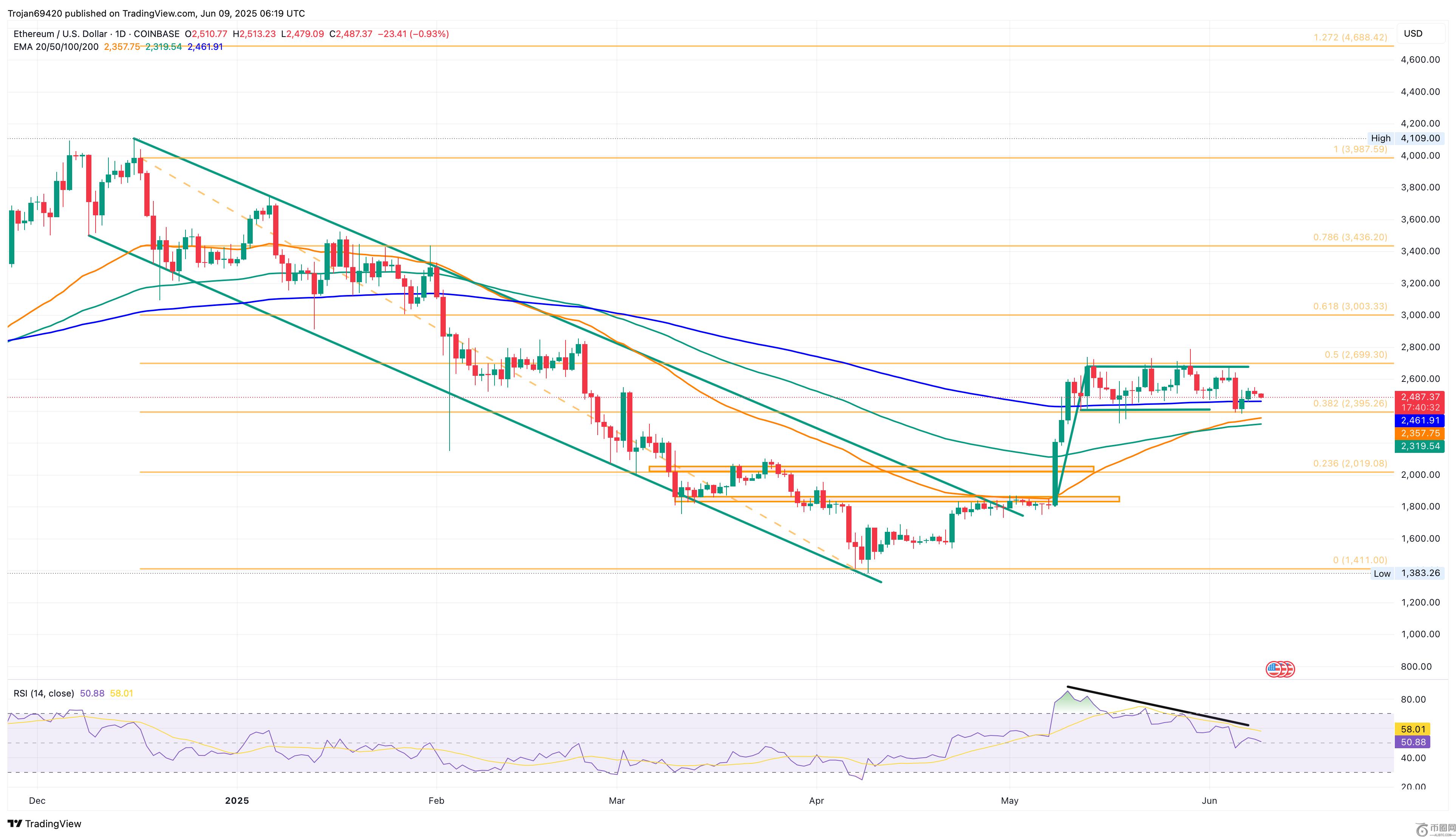 经过短暂的反弹,以太坊已回升至200日均线上方,报2,461美元。然而,在周日十字星K线之后,以太坊盘中回调近1%,预示着其可能跌向38.2%斐波那契水平。
