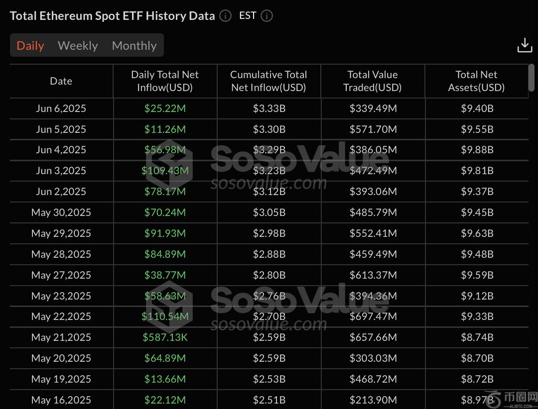 美国现货以太坊ETF已连续15天录得资金流入,累计超8.37亿美元。6月6日,日净流入达2522万美元,其中贝莱德(BlackRock)净流入1586万美元,灰度(Grayscale)净流入937万美元。