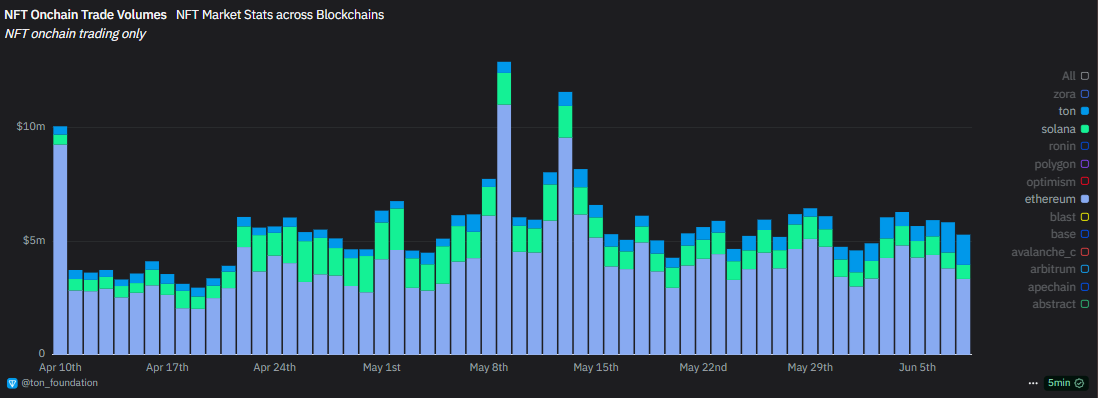 TON 的表现经常**于 Solana,尽管在以太坊的链上 NFT 兑换方面仍略逊一筹。Telegram 收藏品礼物也可以在链下兑换,而且活跃度和交易量都更高。|