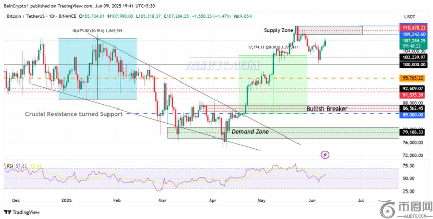 这张图表显示,截至撰写本文时,BTC 的交易价格为 107,234 美元。在确认了下降楔形形态 20% 的目标价后,这一先锋加密货币价格飙升至 111,980 美元的历史高点。