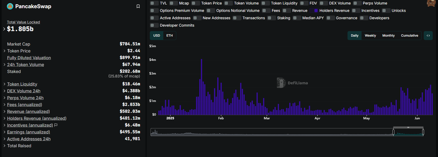 PancakeSwap 的 CAKE 在每日收入方面**
