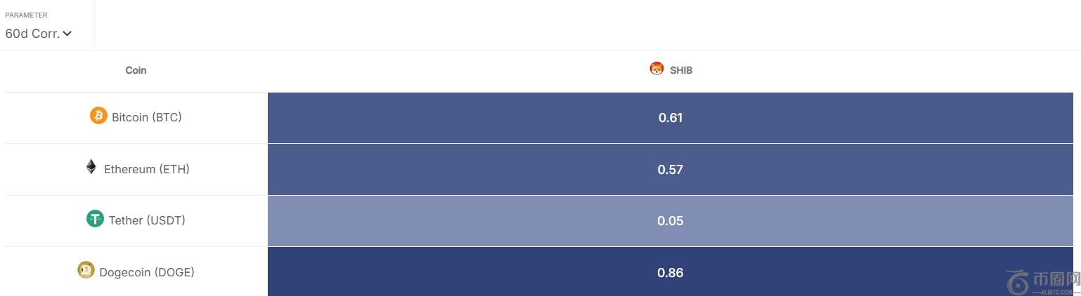 与此同时,进入街区图表显示 Shiba Inu 与整体加密货币市场之间存在中等相关性。作为对比,过去 60 天内,比特币与 Shiba Inu 的相关系数为 0.61,以太坊为 0.57,狗狗币则更高,为 0.86。