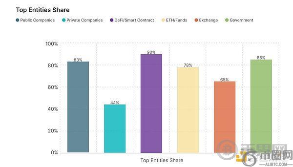 虽然**化交易所持有的比特币数量接近一半,但值得注意的是,其中许多资产是托管的,由散户投资者持有。报告强调,在 DeFi、ETF 和上市公司等机构类别中,前三大持有者控制着比特币总持有量的 65% 至 90%。这种集中度凸显了早期采用者和主要机构参与者在塑造市场动态方面的持续影响。