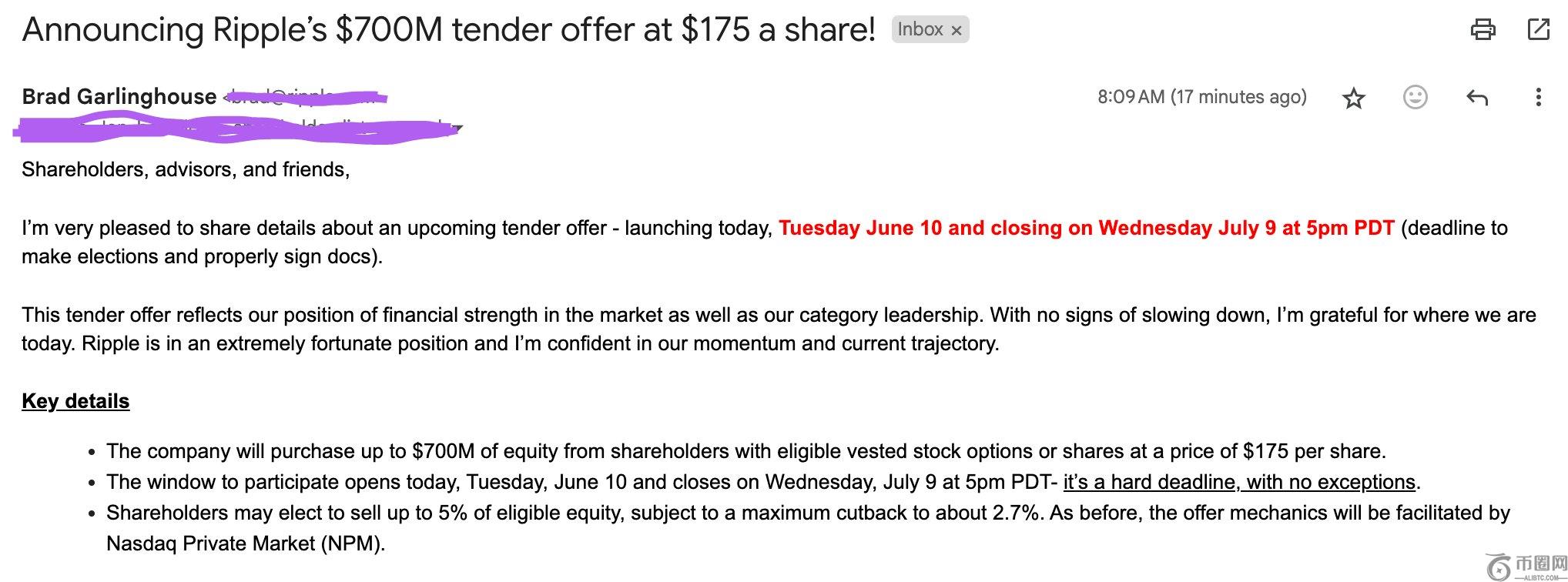Ripple 宣布以每股 175 美元的价格向股东发出 7 亿美元的回购要约。
