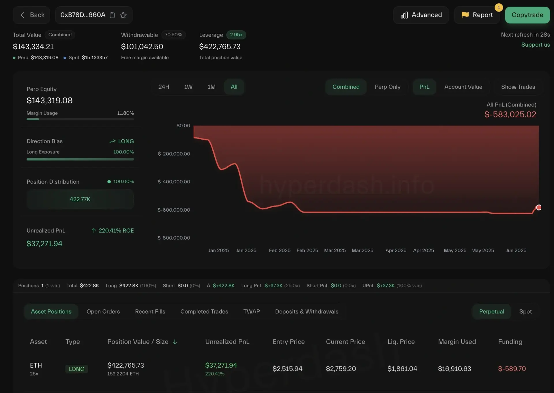 他在 Hyperliquid 上进行了 76 笔交易,只有 27 笔获胜——胜率为 35.53%,总损失为 58.3 万美元。