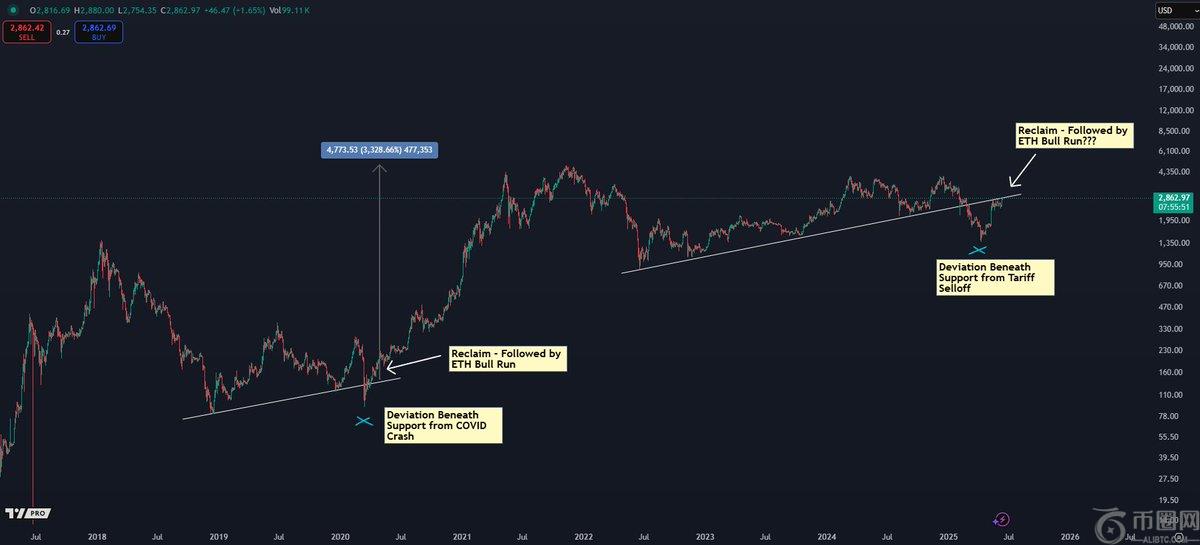 图表显示,我们现在的走势与 2020 年的走势有很多相似之处。2020 年春季,新冠疫情引发了大规模抛售,导致 ETH 跌破 HTF(高时间框架)支撑位。一旦该支撑位被收复,ETH 在接下来的 20 个月里就一路上涨。最近导致 ETH 跌破 HTF 支撑位的抛售,是由市场对特朗普关税的恐慌引起的。ETH 目前正处于收复该支撑位的边缘。历史会重演吗?这会导致 ETH 再次迎来牛市,并伴随山寨币的繁荣。