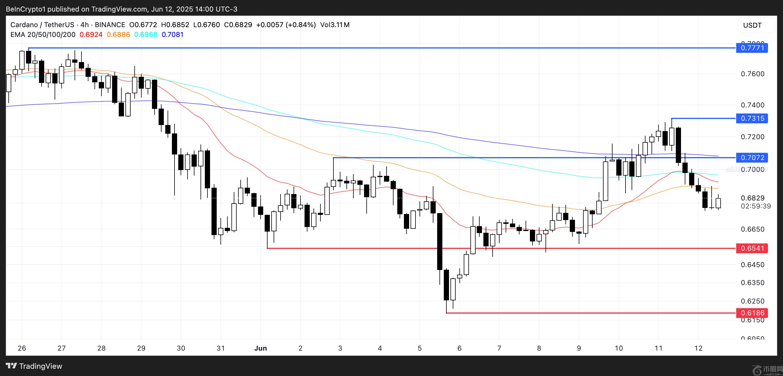 卡尔达诺价格目前窄幅波动,阻力位在 0.707 美元,支撑位在 0.654 美元。这一盘整区域为未来几个交易日的潜在突破(或下跌)奠定了基础。