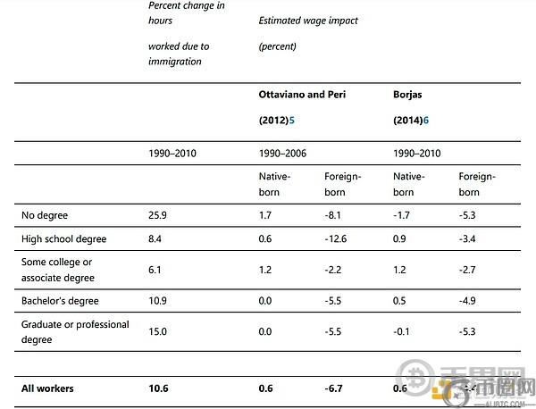 表2呈现了过去几十年来两项关于移民对工资影响的学术分析结果。这两项研究考虑了企业的投资反应以及移民工人和本土工人之间的不**替代性。他们发现,移民对本土工人的平均工资产生了微小但积极的影响,约为半个百分点。其中一项研究表明,没有高中或大学学历的人的工资略有下降,而另一项研究则发现工资只出现了正增长。形成鲜明对比的是,两项研究都发现,早期移民的工资平均下降了4%至7%,主要集中在受教育程度**和**的人群中。