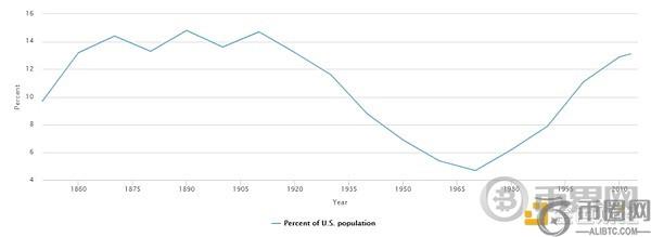 图 1 显示,近几十年来,外国出生人口迅速增长,从 1970 年占美国人口的不到 5% 上升到 2013 年的 13%。尽管如今移民占美国人口的比例比二战以来的**时候都要大,但目前外国出生人口的比例与 19 世纪末和 20 世纪初大致相同,当时约有 15% 的美国居民出生在外国。