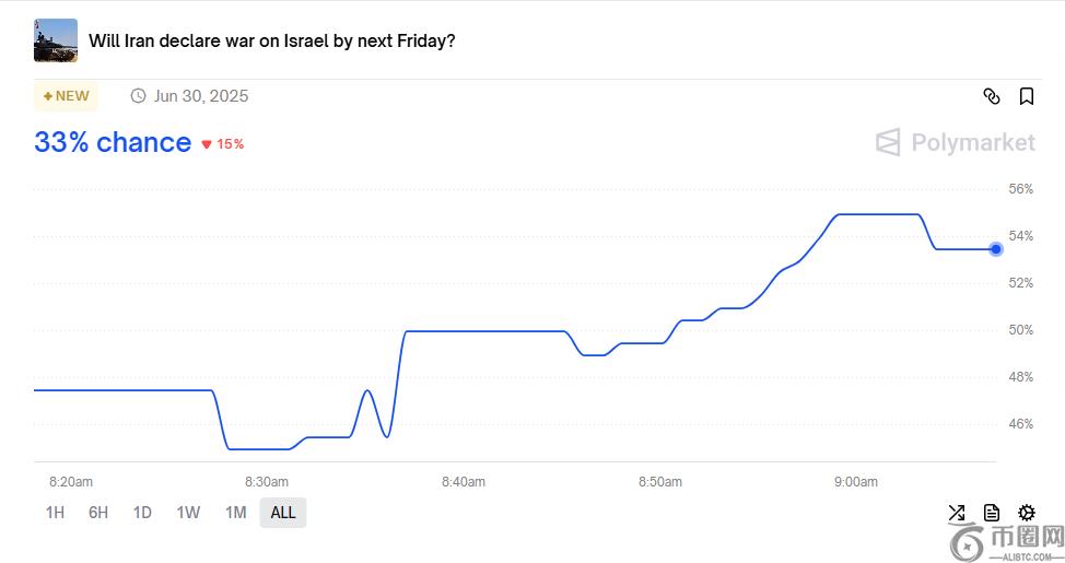 袭击消息传出后,该平台上出现了几份新的**,倾向于伊朗采取报复行动。Polymarket 的**显示,冲突在下周五前平息的可能性仅为 12%,而伊朗在同一时间段内向以色列宣战的可能性则从周五凌晨的 55% 降至 33%。