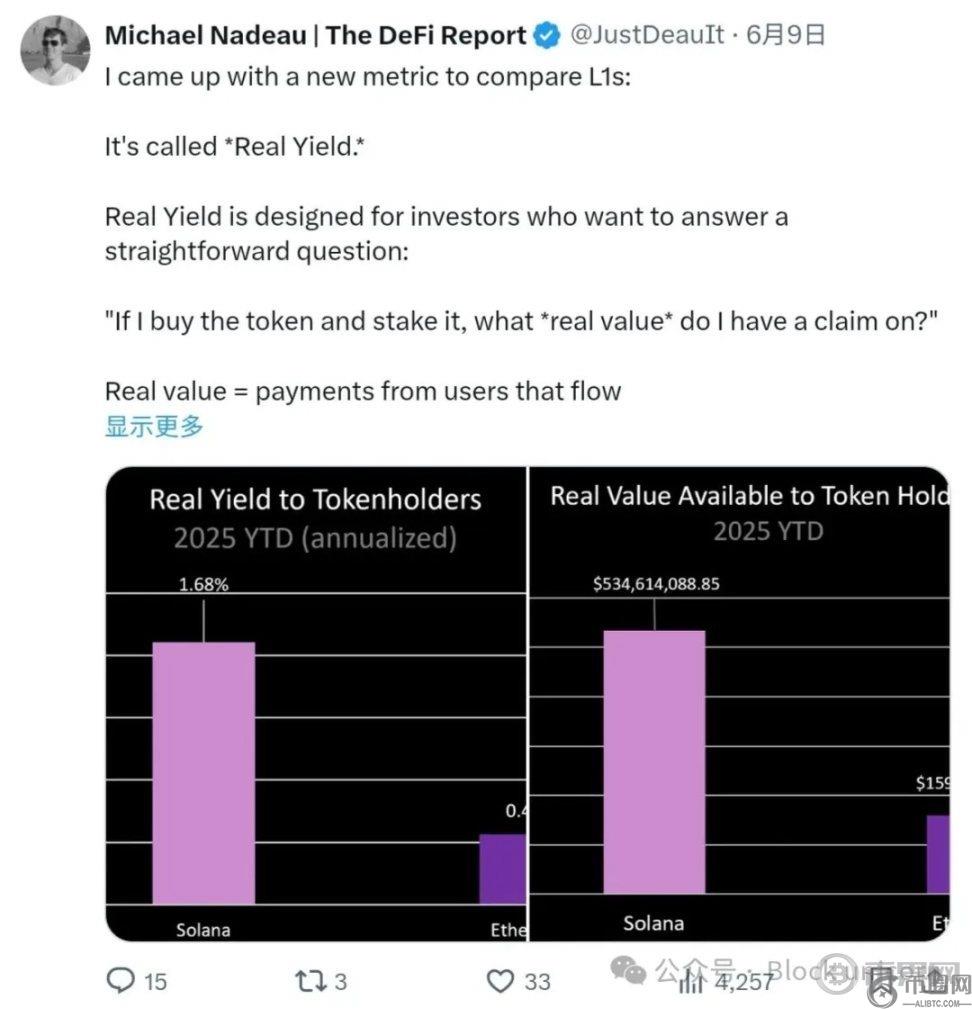 @JustDeauIt 提出了一个有趣的观点:真实收益率(Real Yield)是一个通过分解质押**可获得的真实价值来比较 L1 网络的指标,**关注用户支付、MEV(矿工可提取价值)和网络经济学。这是对 L1 网络健康状况的很好评估: