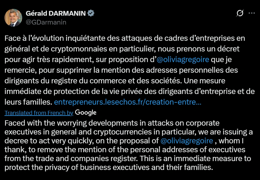 法国**部长热拉尔·达尔马南(热拉尔德·达尔马宁)敦促将加密货币公司所有者和管理人员的地址从官方商业登记册中删除。