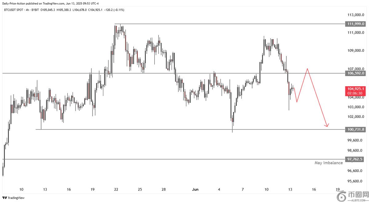 BTC 周四跌破 106,600 美元后可能出现的走势:周五回调/盘整,周末反弹(散户投资者通常如此)至 106,000-107,000 美元,然后再次探底 100,000 美元。如果持续突破(高位时间框架),突破 107,000 美元,则将失效……