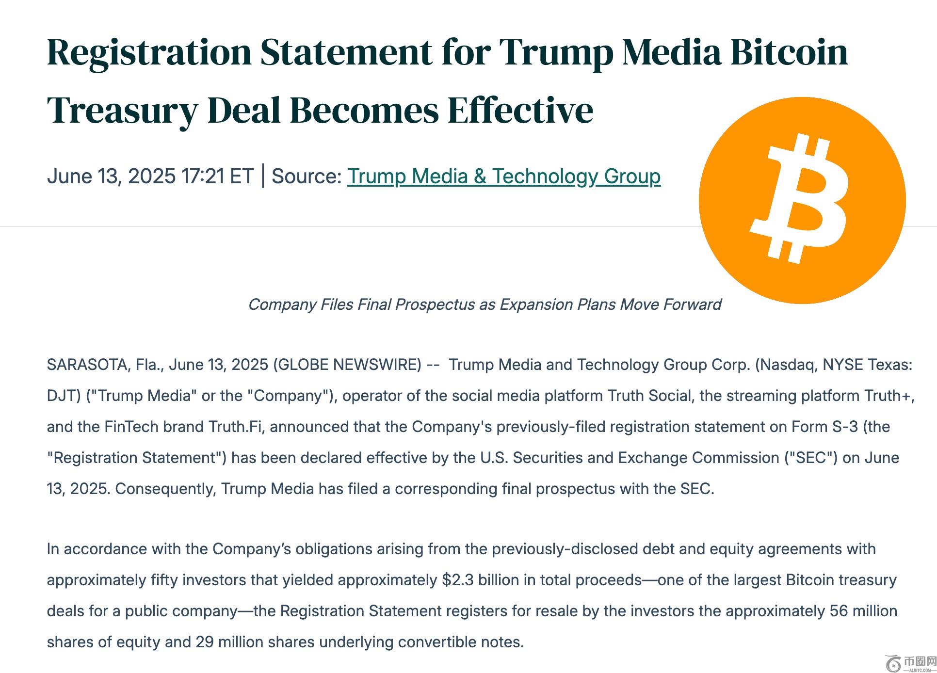 文章标题:美国证券交易委员会批准特朗普媒体购买价值 23 亿美元的比特币作为比特币国库券的计划
