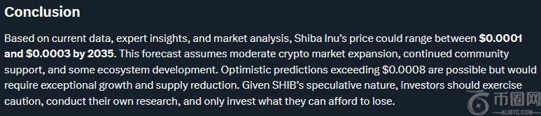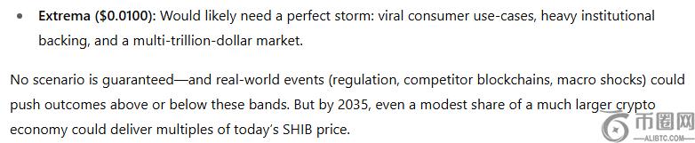 有趣的是,ChatGPT 为 Shiba Inu 设定了最雄心勃勃的 2035 年价格目标。具体来说,ChatGPT 预测,到 2035 年,SHIB 的价格可能会飙升至 0.01 美元的高位,这可能是受到强大的机构支持和数万亿美元的加密经济的推动。