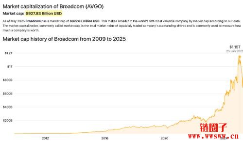 图为博通在 2025 年 1 月创下 1.15 兆美元市值**纪录