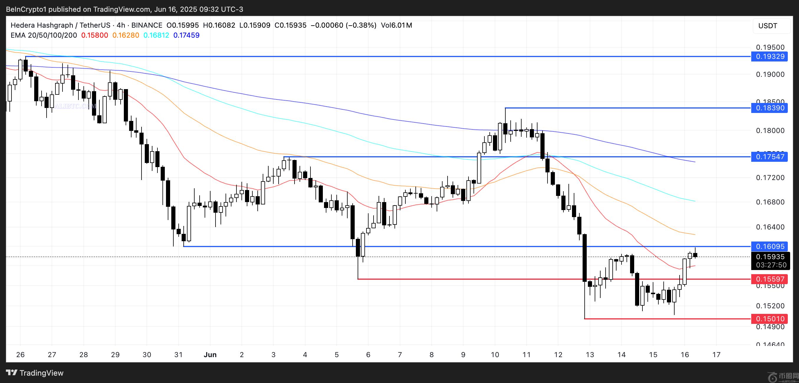 Hedera 面临 0.160 美元至 0.155 美元之间的关键时刻,由于短期指数移动平均线 (EMA) 继续低于长期指数移动平均线,常春藤价格仍处于看跌技术结构之下。