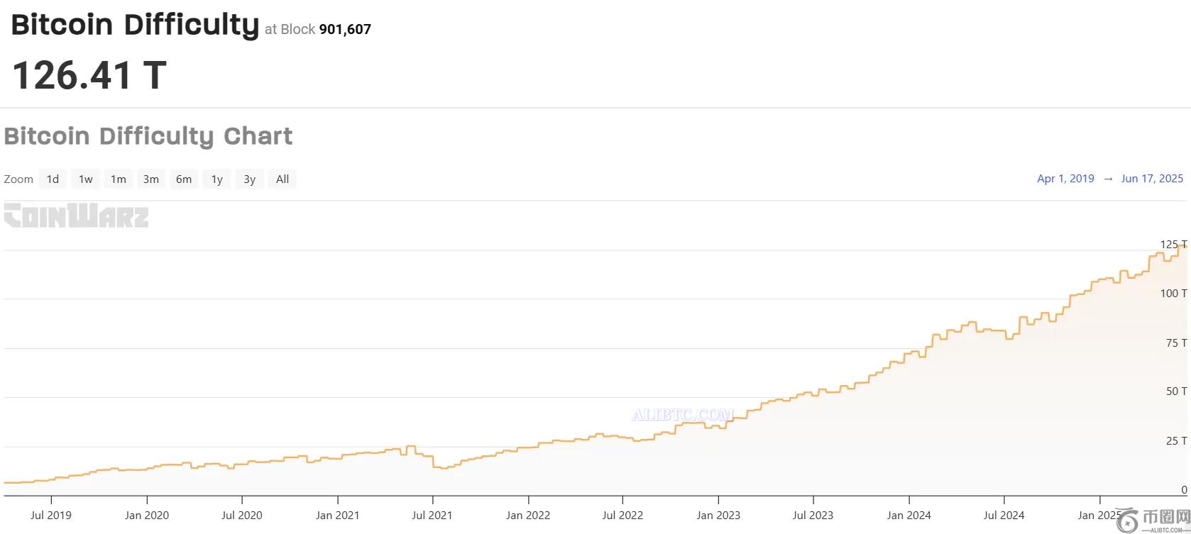 TheMinerMag 指出,比特币的挖矿难度已超过 126 万亿。Coinwarz 的数据也印证了这一点,图表显示近年来难度急剧上升。