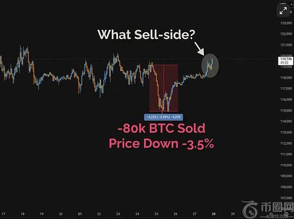 然而,令人惊讶的是,这次大规模抛售对市场的影响微乎其微。比特币价格仅从历史高点119,000美元下挫至115,000美元,跌幅约为3.5%,并在清仓次日迅速回升至118,000美元。