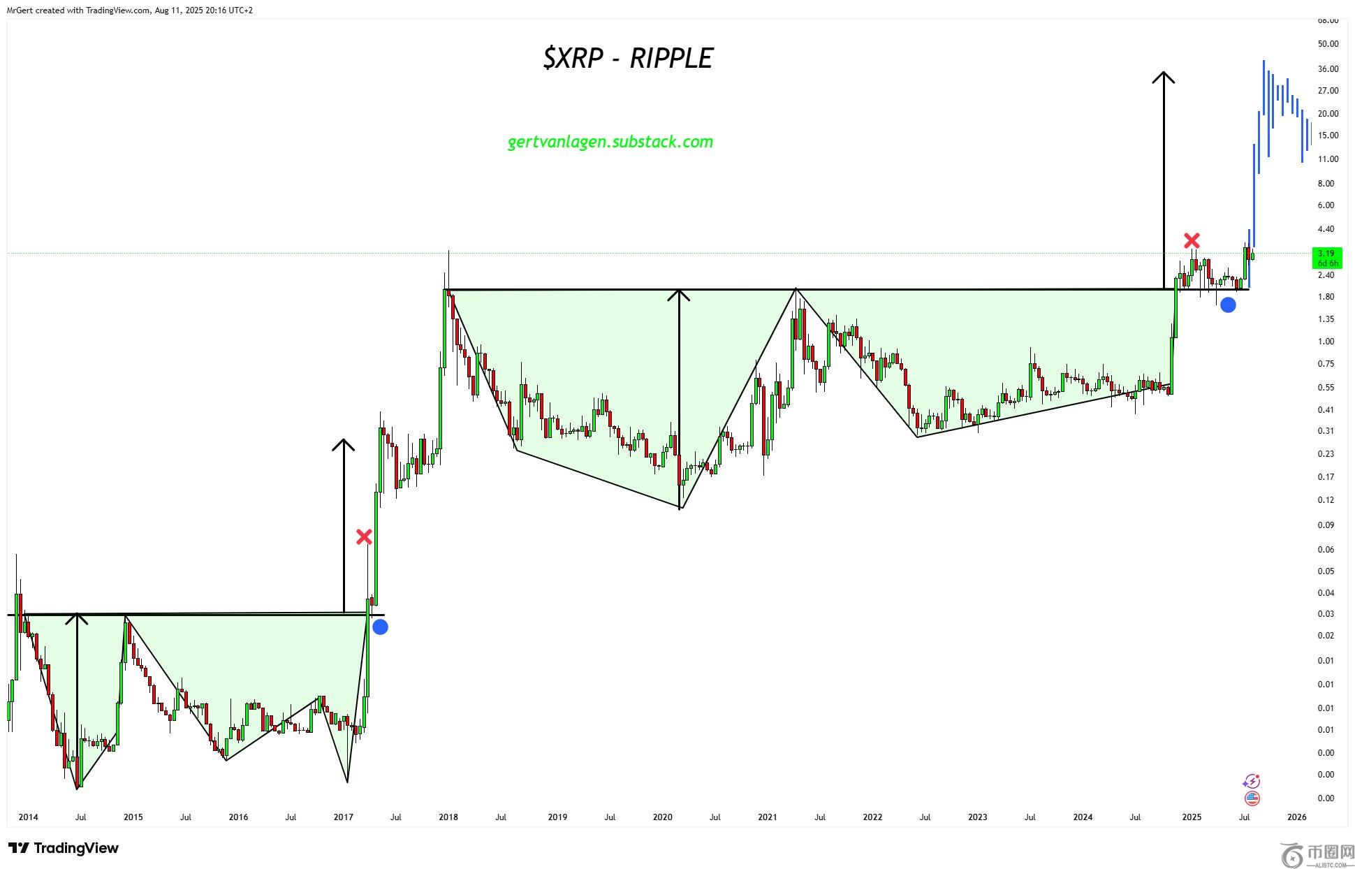 同时,范拉根在分析中以 2014 年至 2017 年市场行情的历史背景作为目标。具体来说,从 2014 年到 2017 年,XRP 形成了类似的双底结构。突破这一结构引发了**性反弹那看见 XRP 打距离 0.028 美元的颈线价位为 0.3988 美元。