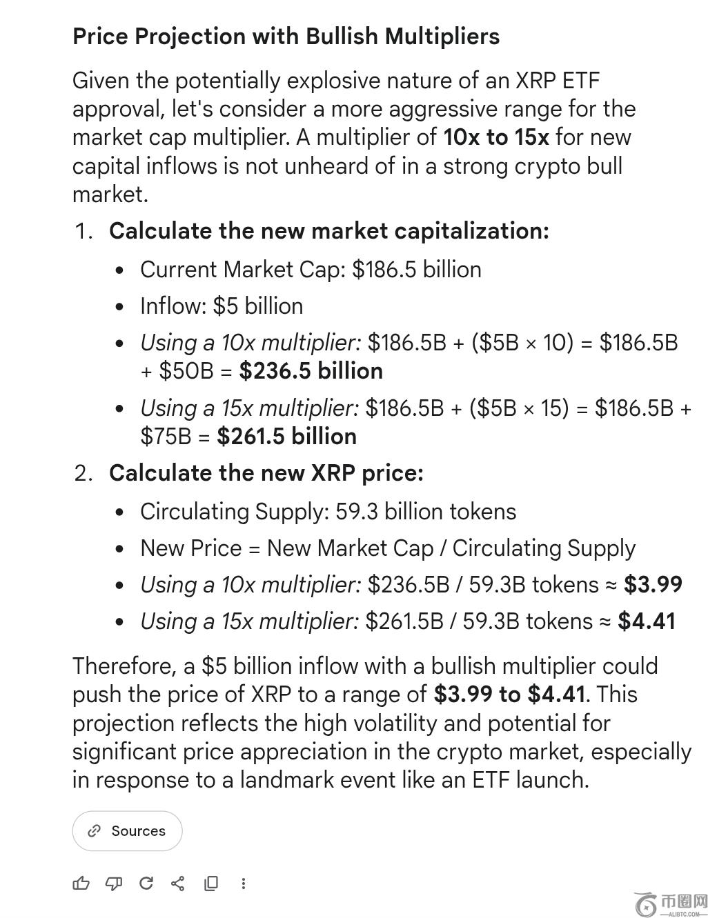 申请那与 McClurg 估计的 50 亿美元 ETF 流入量相同的比率将推XRP 的市值向上 经过 关于1.36万亿美元。XRP 目前交易价为 3.15 美元,市值为 1865 亿美元,流通**数量为 593 亿枚,此次上涨将使其总市值达到约 1.546 万亿美元。届时,XRP 的交易价格将接近 26 美元/枚。