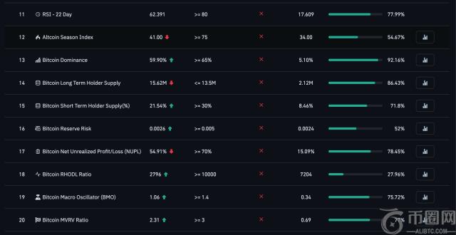 比特币牛市峰值指标追踪Coinglass 网站上的信息有助于显示何时是退出市场的好时机。 基本上, 尝试在**点卖出过去几年,随着价格波动,这些指标均有所改进,但迄今为止尚未取得**进展。下图显示了正在跟踪的指标完整列表及其进展: