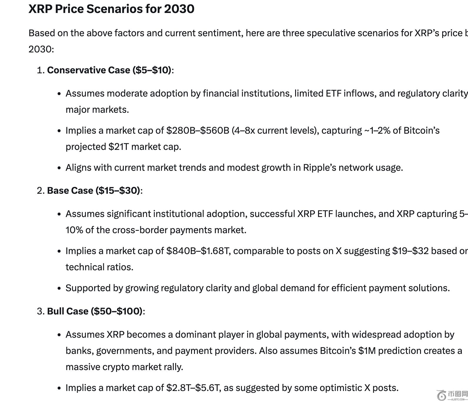 X 的 Grok AI估计的XRP 的价格在基准情景下可能在 15 美元至 30 美元之间波动,相当于 8400 亿美元至 1.68 万亿美元的市值。报告补充称,如果机构广泛采用并监管有利,XRP 的价格可能达到 50 美元至 100 美元。