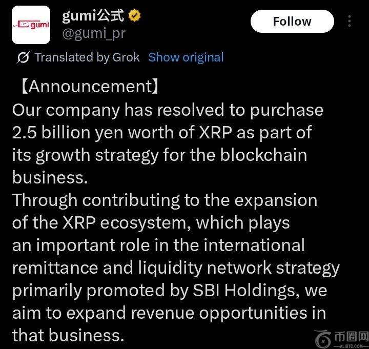 文章标题:日本游戏巨头 Gumi 宣布计划投资 25 亿日元购买 XRP 以扩展区块链业务