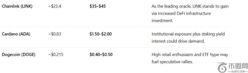 Chainlink 因其作为下一个 RWA(真实世界资产)基础链的潜力而备受关注。Cardano 则凭借其去**化特性,为华尔街资产登陆 ADA 链提供了**机会。狗狗币 (Dogecoin) 也因其即将到来的 ETF 批准而受到广泛关注,这可能会使 DOGE 的价格迅速突破 1 美元大关。