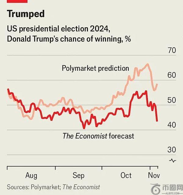 数据表明,预测市场在这次大选中的表现非常出色。《经济学人》报道,尽管卡马拉·哈里斯一度引发狂热情绪并在许多摇摆州**,但特朗普的胜选几率从未低于50%。Polymarket和Kalshi的预测在选举夜前数小时便已高度接近实际结果。
