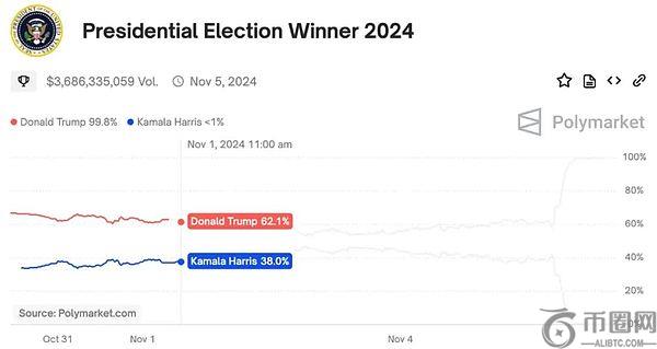 2024年10月下旬,一名来自巴黎的交易员Théo在Polymarket上押注3000万美元支持特朗普获胜。他将这笔赌注视为对民调数据准确性的反向押注。**,特朗普的大胜让他收获了5000万美元奖金。